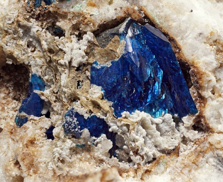 Veszelyite crystals isolated or in small groups, very sharp, of extraordinary quality for the species and very similar to the famous ones from the Black Pine mine but even more intense in color. They are translucent, lustrous and deep blue, and on a matrix with white Hemimorphite. Only a few specimens of this type were uncovered during the finds of the year 2021.Sanguozhuang, Dongchuan District, Kunming Prefecture, Yunnan Province China (2021)