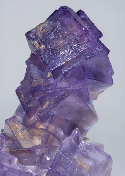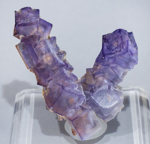 Double elongated cluster of cubic Fluorite crystals beveled by the faces of the dodecahedron. They are translucent, with lilac color on their faces and strongly saturated violet color on the edges. They are partially coated by Baryte and they growth around a Stibnite crystal that is partially visible by transparence.The specimen has been published in the book 'China II', by Berthold Ottens, on page 370