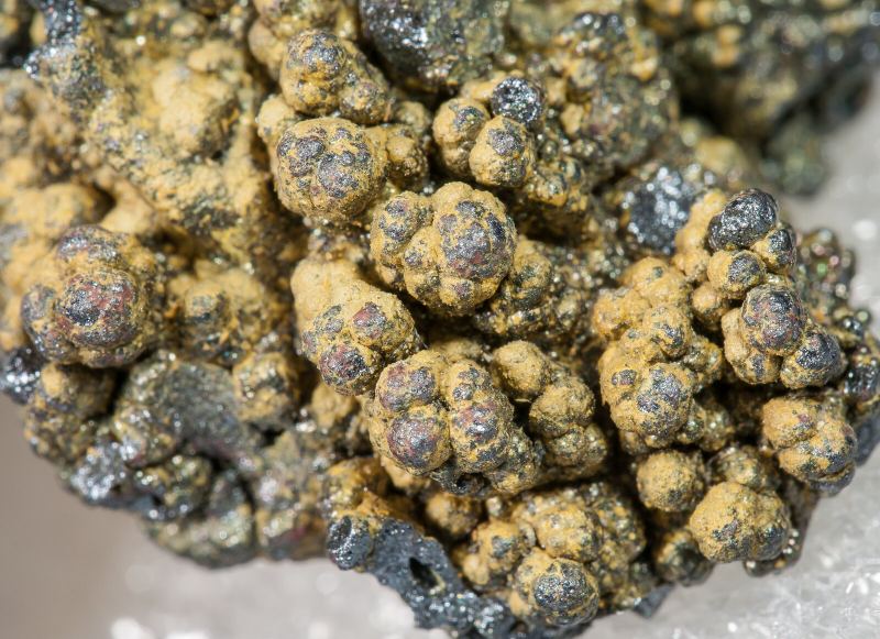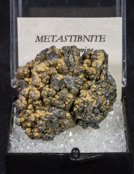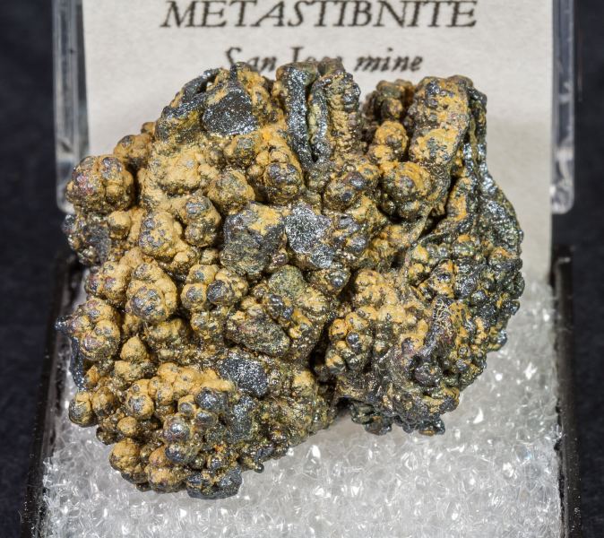 Very dark gray spheroidal and columnar growths of Metastibnite, a rare dimorph of Stibnite, with subsequent coatings of antimony oxides.San José Mine, Oruro City, Cercado Province, Oruro Department Bolivia