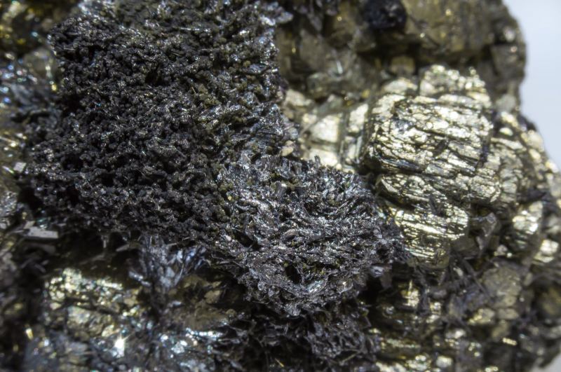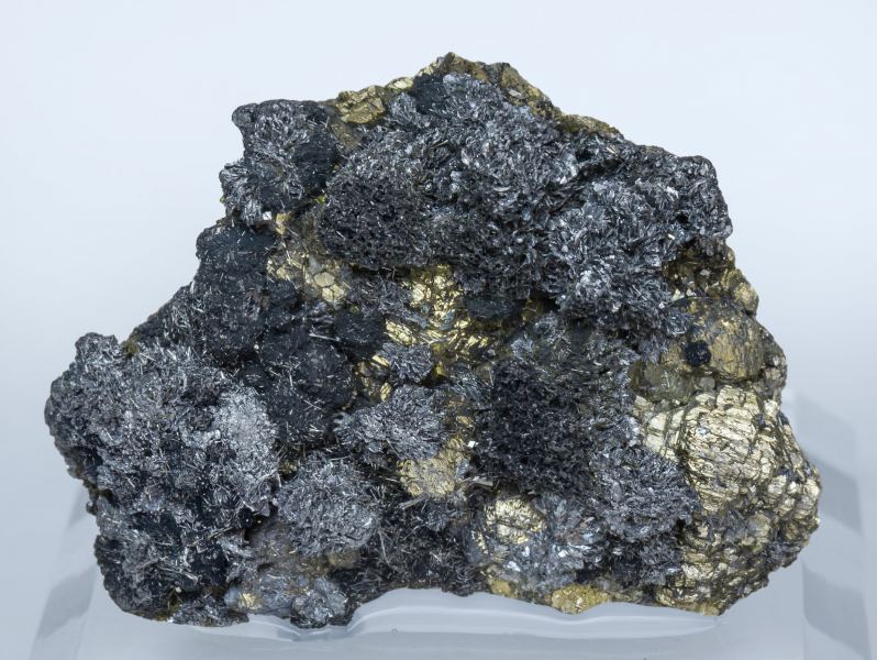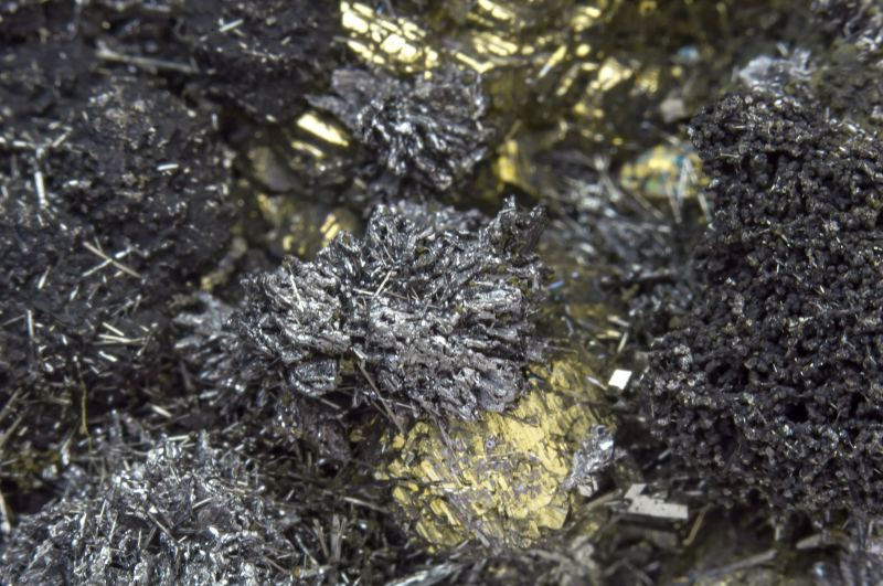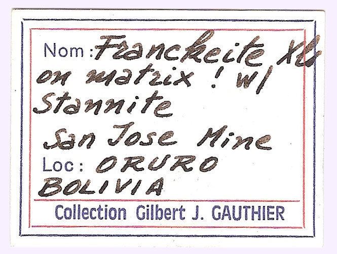 Spheroidal growths of small Franckeite crystals that are metallic dark gray, almost black, and are very well defined and bright. They are on matrix with Pyrite and very well defined Stannite crystals. An excellent sample of this rare mineral.The sample was in the Gilbert Gautier collection whose label we will send to the buyer.