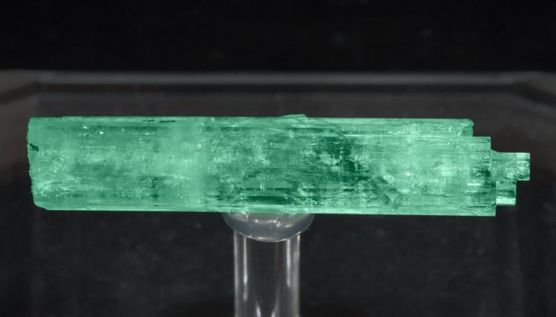 Doubly terminated floater crystal with very well defined faces and edges and excellent terminations, one of them simple and pinacoidal, the other showing an unusual polycrystalline growth with a deep structural incision that seems to break the crystal longitudinally into two symmetrical parts. The sample is transparent, bright and vividly colored.Chivor mining district, Municipio Chivor, Eastern Emerald Belt, Boyacá Department Colombia