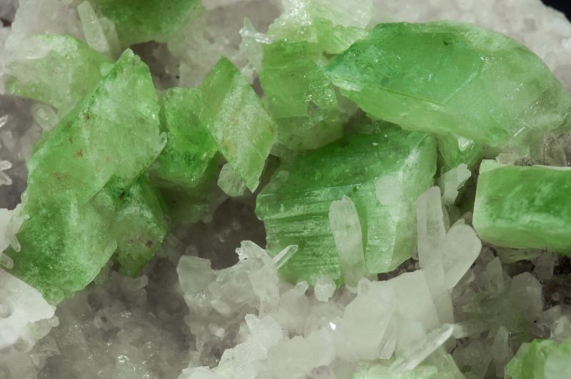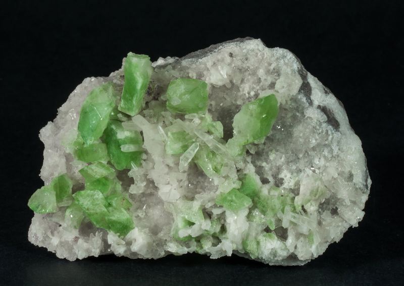 Very sharp isolated crystals of Augelite with very sharp crystal forms, translucent, with good luster and an intense light green color. They are implanted on a matrix with fine transparent Quartz crystals.Tamboras Mine, Mundo Nuevo, Huamachuco, Sánchez Carrión Province, La Libertad Department Peru