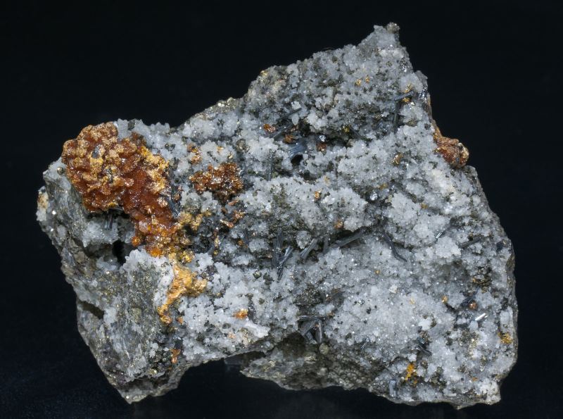 Bundle-like aggregates of Hutchinsonite, a rare sulphoarsenide of thallium and lead, with elongated crystals that have very well defined faces and edges and are very much brighter than usual for the species. They are on matrix, with Orpiment and Quartz.Quiruvilca Mine (La Libertad Mine), Quiruvilca District, Santiago de Chuco Province, La Libertad Department Peru (09/2015)