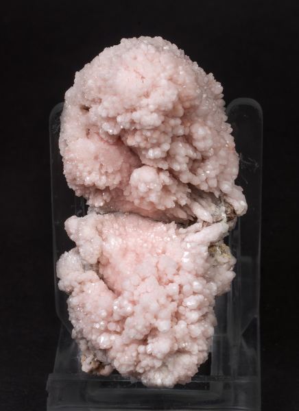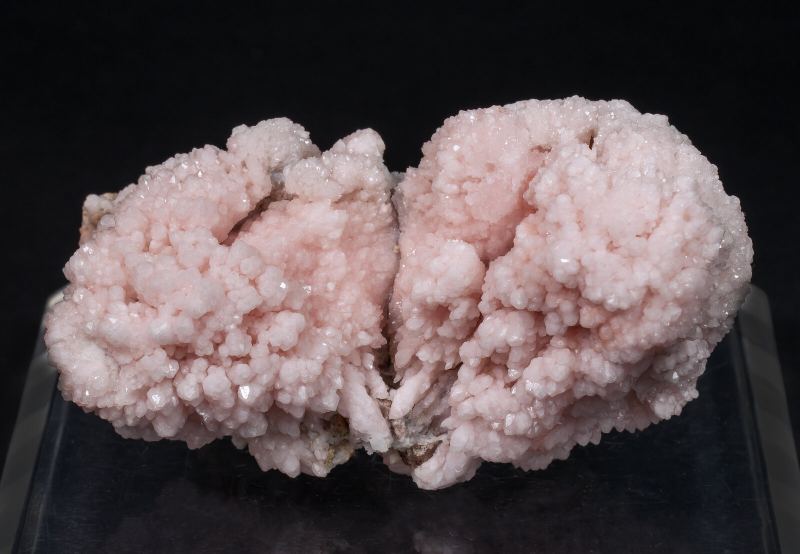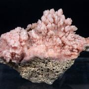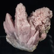 A novelty at Tucson Virtual 2021. Original fan-shaped growths on a matrix of translucent Quartz crystals, with bright luster and an intense pink color, the color being their intrinsic natural color, not due to inclusions of iron oxides. The precise name of the mine is not yet known, but surely with the passage of time it will become known.Huancayo Province, Junín Department Peru (2020)