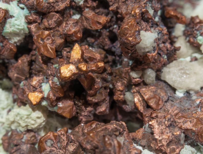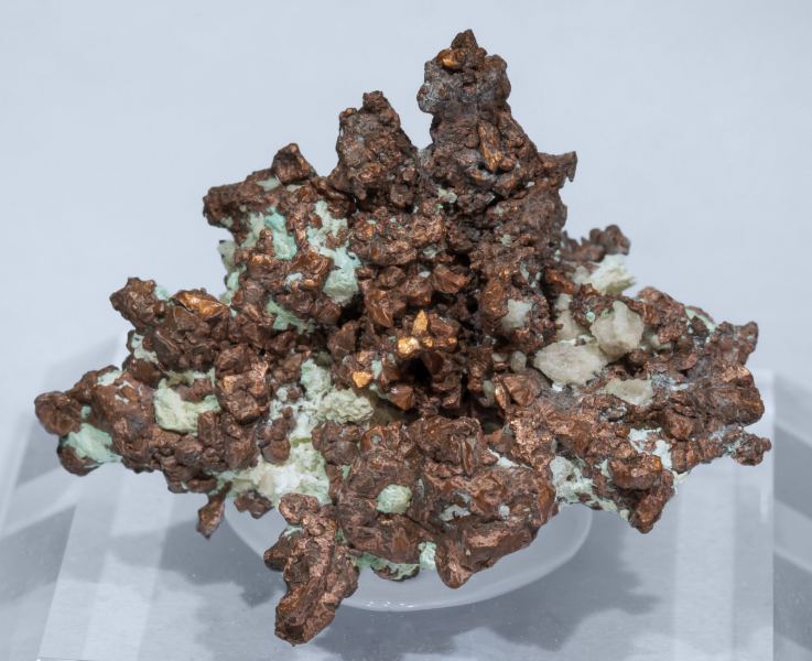 Arborescent growths of slightly deformed cubo-octahedral crystals with very well defined faces and edges and on matrix. The sample is from a locality that is not well known by collectors.Cobriza Mine, Churcampa, San Pedro de Coris District, Churcampa Province, Huancavelica Department Peru (01-03/2014)