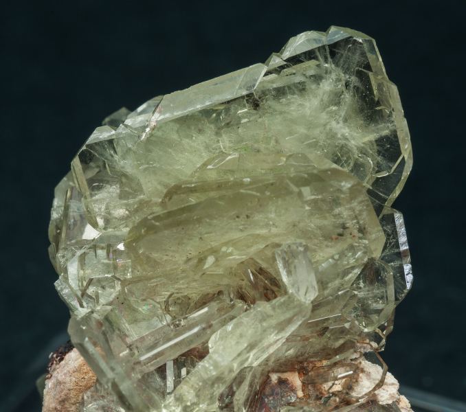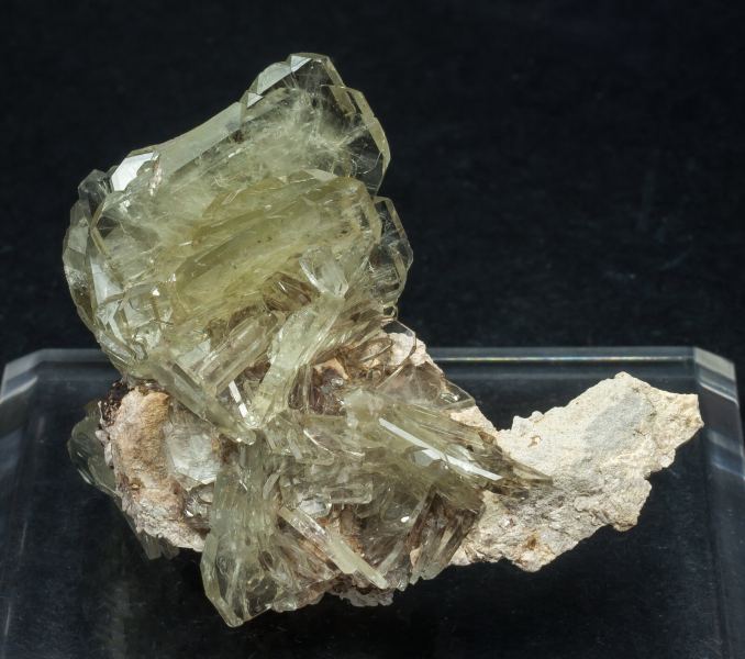 Polycrystalline growths of tabular Baryte crystals, fine, very sharp and complete, translucent, lustrous and with a slightly smoky color, on a Dolomite matrix.Warihuyn Hill, →2850 m., Puños, Miraflores District, Huamalíes Province, Huánuco Department Peru