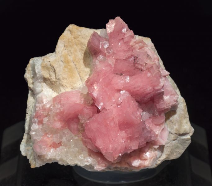 Very sharp rhombohedral Rhodochrosite crystals with very marked polycrystalline growths on the surface of the faces, brighter and more vivid pink than usual in specimens from this locality. On matriz, with small Quartz crystals. A fine miniature.Manuelita Mine, ↓1400 m., Morococha District, Yauli Province, Junín Department Peru (03/2019)