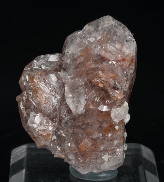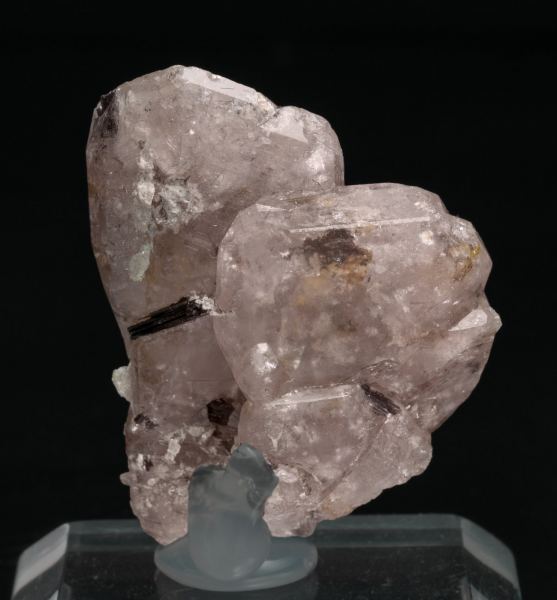 A novelty at Tucson 2014. Complex group of Fluorapatite crystals, very rich with crystalline forms including a translucent dominant prism with parallel growths and with small Tourmaline crystals. The color, clearly pink in daylight, acquires brownish shades under electric lightning.Golconda pegmatite, Governador Valadares, Vale do Rio Doce, Minas Gerais Brazil (11/2013)