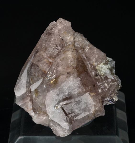 A novelty at Tucson 2014. Complex group of Fluorapatite crystals, very rich with crystalline forms including a extraordinarily bright dominant prism with tourmaline and small white Bertrandite crystals. The color, clearly pink in daylight, acquires brownish shades under electric lightning.Golconda pegmatite, Governador Valadares, Vale do Rio Doce, Minas Gerais Brazil (11/2013)
