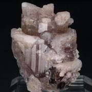 A novelty at Tucson 2014. Aggregate of prismatic Fluorapatite crystals with a dominant prism and complex terminations, very rich with crystalline forms. They are translucent, extraordinarily bright and are with small Tourmaline crystals. The color, clearly pink in daylight, acquires brownish shades under electric lightning.Golconda pegmatite, Governador Valadares, Vale do Rio Doce, Minas Gerais Brazil (11/2013)