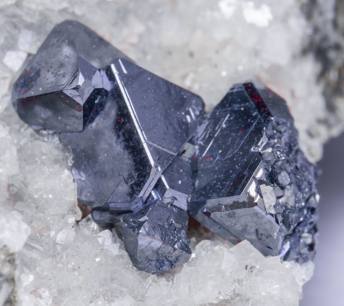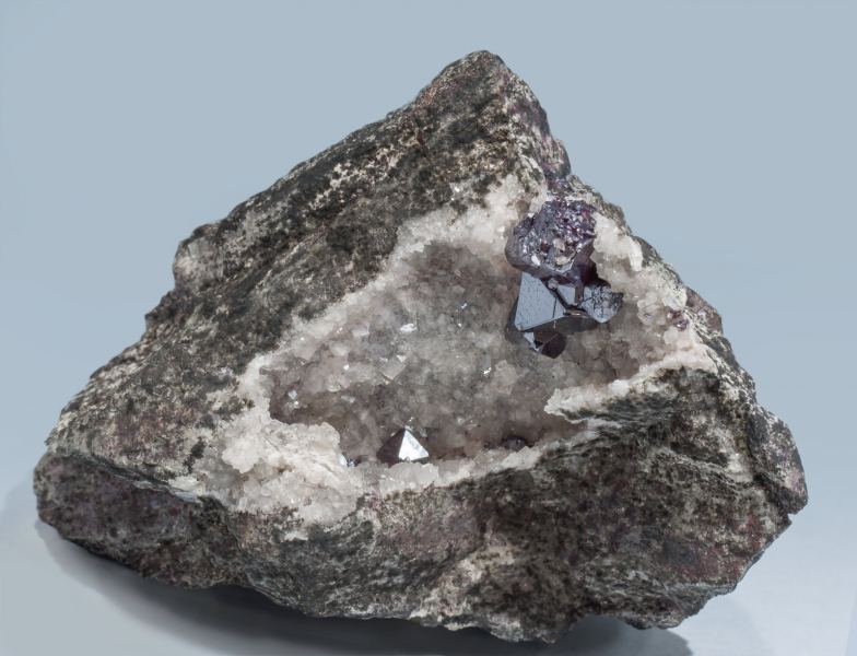 Very sharp octahedral Cuprite crystals. They are very bright, and have a very intense and deep red color visible under an intense light. The Cuprite esthetically contrasts with the white Calcite coating the vug on a rocky matrix.Mashamba West Mine, Kolwezi District, Lualaba, Katanga Copper Crescent, Katanga (Shaba) Democratic Republic of the Congo (Zaire)