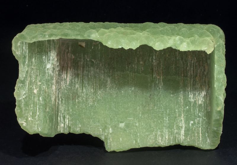 Perimorphic growth of Prehnite crystals with defined crystal forms, translucent and of a vivid and uniform green color. The Prehnite maintains the outline of the Anhydrite crystal on which it was formed, which later disappeared.The specimen comes from the Rock Currier collection (no. 7271), whose label we will send to the buyer.