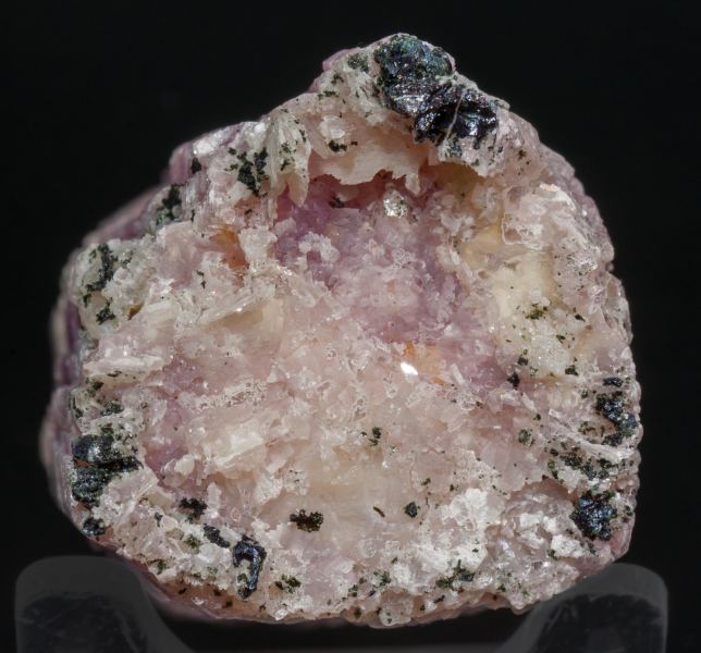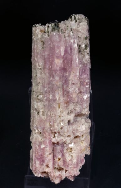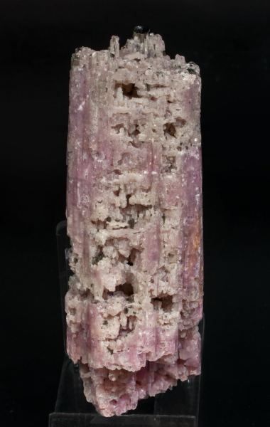A novelty at Munich 2017. Parallel growths of 'lepidolite' crystals pseudomorphous after Elbaite. They are bright with a rich pink color, with channels and other dissolution forms and with the crystalline remains of Elbaite (verdelite variety) on the upper end.Naipa Mine, Alto Ligonha District, Zambezia Province Mozambique (07/2017)