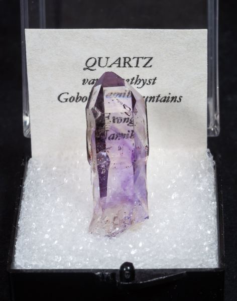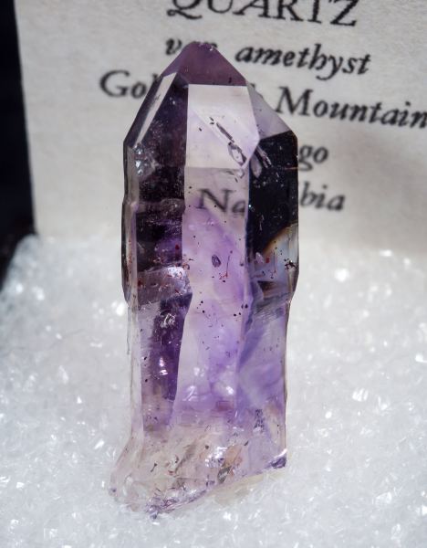 Scepter growth of two transparent Quartz crystals (amethyst variety), with very good luster and distinct color zoning.We will ship the specimen in its original Perky box from the Robert J. (Bob) Noble collection, which also contains the label.