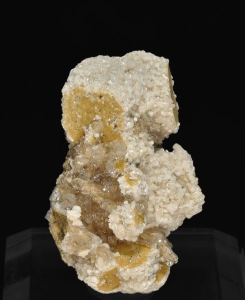 Fanlike groups of snowy white acicular crystals of Bultfonteinite replacing the faces of short elongated crystals of Hydroxyapophyllite-(K) which has a pseudocubic habit. In some cases the replacement is deeper and forms a more or less complete pseudomorph of the preexisting Hydroxyapophyllite-(K). All are on a matrix of clear, complex, crystals of Calcite. Well send a copy of the analysis to the buyer of the piece.The specimen has been reviewed, photographed and published as a new discovery in the magazine Rivista Mineralogica Italiana on page 51 in number 2011/1