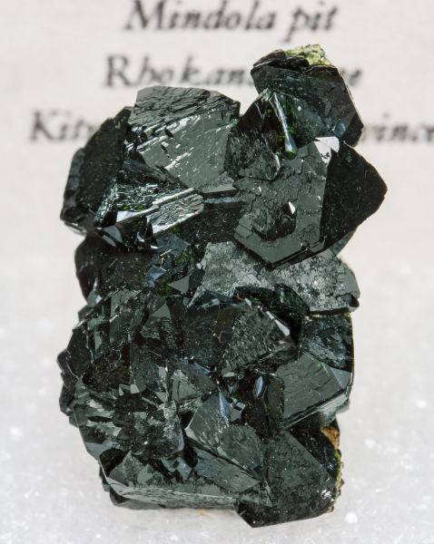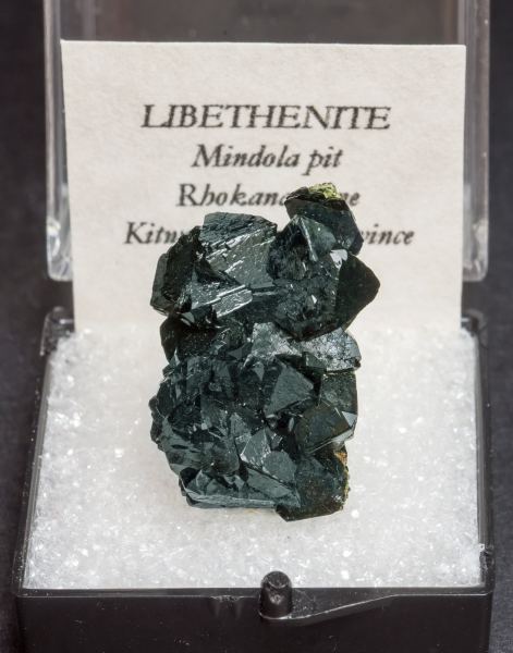 Group of very sharp dipyramidal Libethenite crystals with well defined faces and edges, shiny and with a very deep green color, almost black.We will ship the specimen in its original Perky box from the Robert J. Noble collection, which also contains the label, which shows that it was previously in the James (Jim) Minette collection.