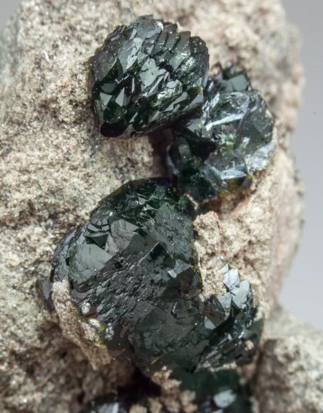 Polycrystalline growth of Libethenite crystals with very well defined faces and edges, very lustrous and with a very deep and uniform green color. On matrix.The specimen is accompanied by the collector's card, Dr. K.J. Reid, in which the date of the find is handwritten and signed.
