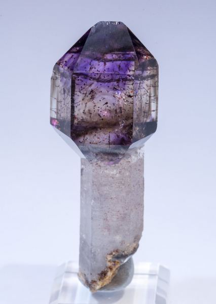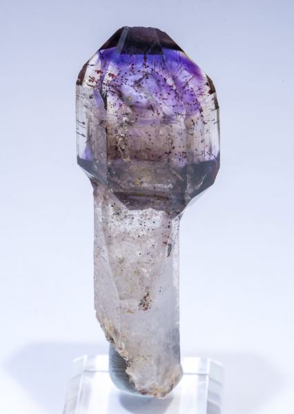 Scepter growth of a transparent Quartz crystal with good luster and phantom growths, abundant inclusions and a very vivid amethyst color with smoky colored areas distributed irregularly in the crystal. Of the best possible quality for the locality, which is not very well known.Chibuku Mine, Zambezi Valley, Mashonaland West Zimbabwe (2018)