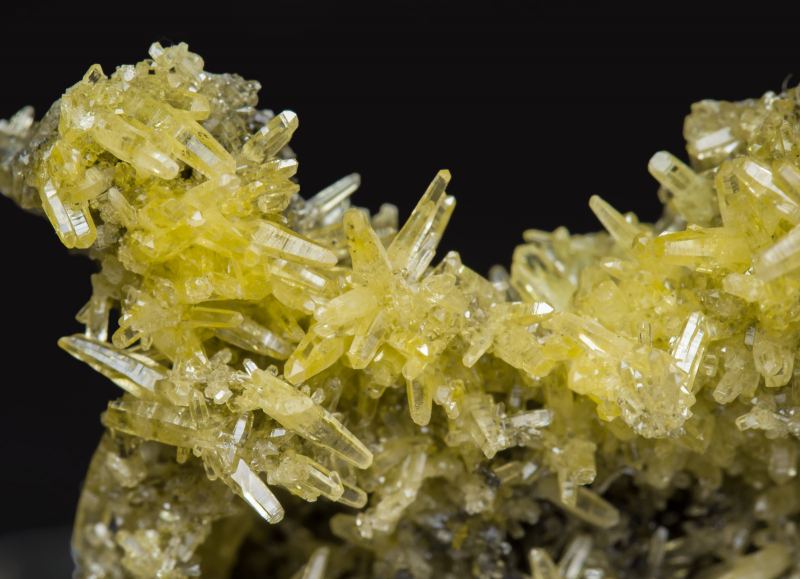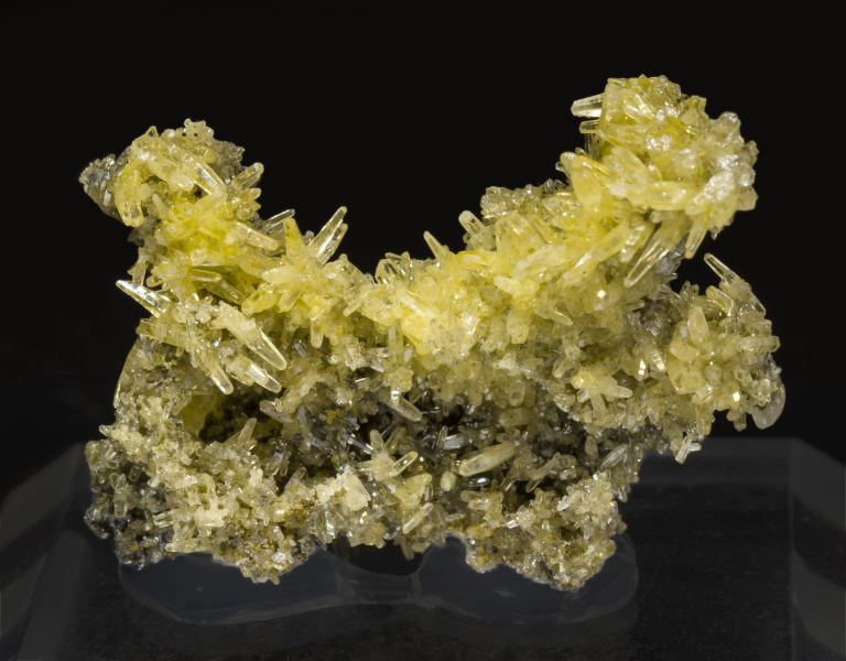 Very elongated crystals of Mimetite, with excellent terminations, transparent, lustrous, intense yellow, on matrix.This piece is from the collection of Philippe Morelon (No. 1100) whose label we will send to the buyer.