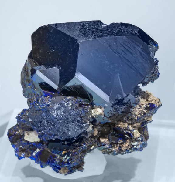 Group of complex Azurite crystals, one of them clearly dominant, with very well defined faces and edges, bright and with a very deep color with vivid reflections and transparencies. A classic from Tsumeb.Tsumeb Mine, Tsumeb, Otjikoto Region Namibia (1975)