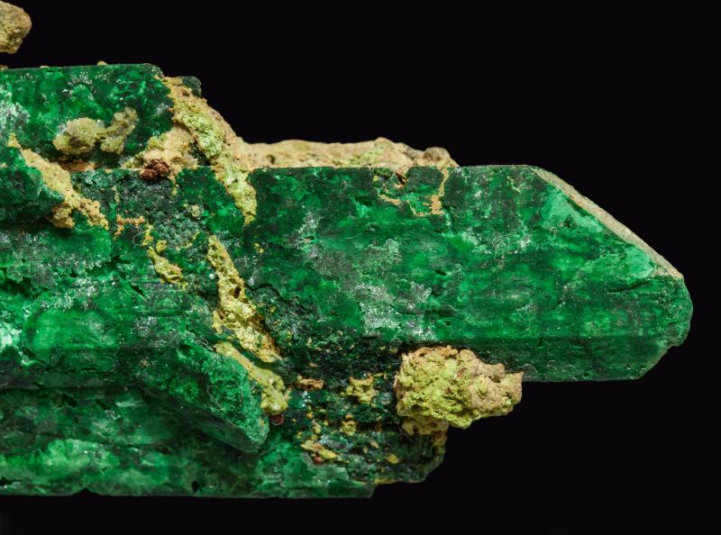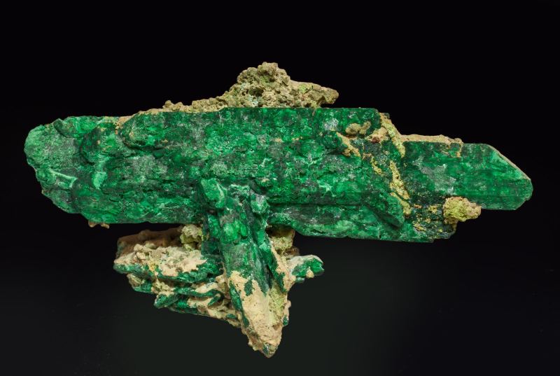 Sharp group of pseudomorphic Malachite after doubly terminated Azurite crystals, one of them clearly dominant, with very marked polycrystalline growths.Tsumeb Mine, Tsumeb, Otjikoto Region Namibia