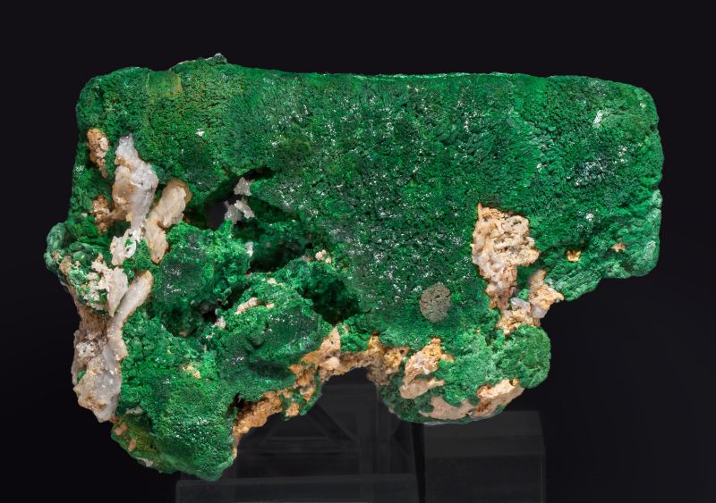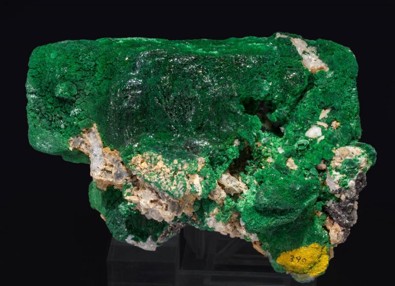 Malachite pseudomorphic after a group of Azurite crystals, one of them clearly dominant, large, and doubly terminated, with Cerussite, on matrix.Tsumeb Mine, Tsumeb, Otjikoto Region Namibia