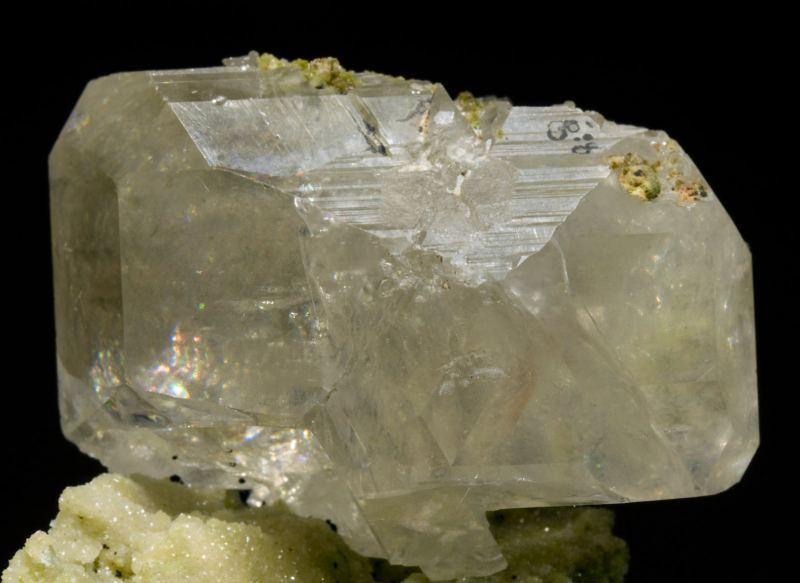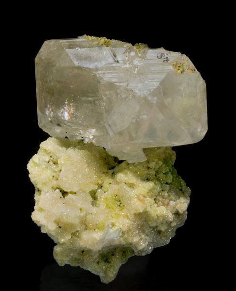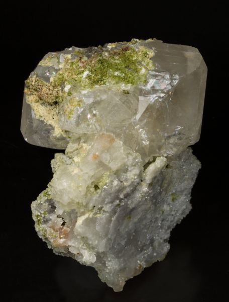 Very aerial, transparent and bright, twinned crystal. It is implanted on a Quartz matrix rich in small clear green crystals of Smithsonite.Tsumeb Mine, Tsumeb, Otjikoto Region Namibia