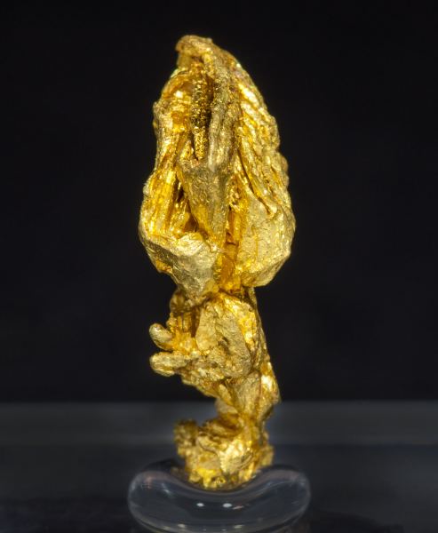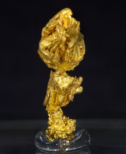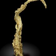 From a very recent find in the area of Western Sahara in Morocco, with the specific location yet to be determined, this specimen of Gold, very well crystallized and with brilliant luster, displays a sharply defined morphology, with the dominant forms of the octahedron, twinned according to the spinel law and with curious hooked ends.We will see what the future of the locality holds for these high quality absolute novelties.