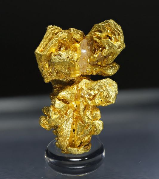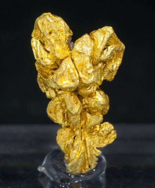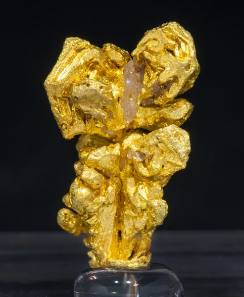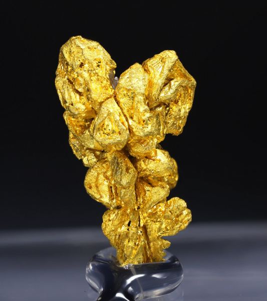 From a very recent find in the area of Western Sahara in Morocco, with the specific location yet to be determined, this specimen of Gold, very well crystallized and with brilliant luster, displays a sharply defined morphology, with the dominant forms of the octahedron in highly stylized parallel growths, distinctly twinned according to the spinel law and with curious hooked ends.We will see what the future of the locality holds for these high quality absolute novelties.