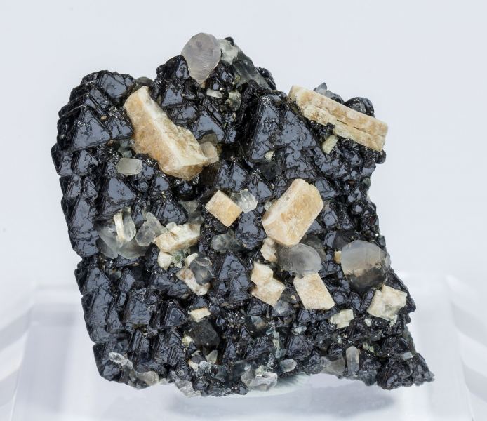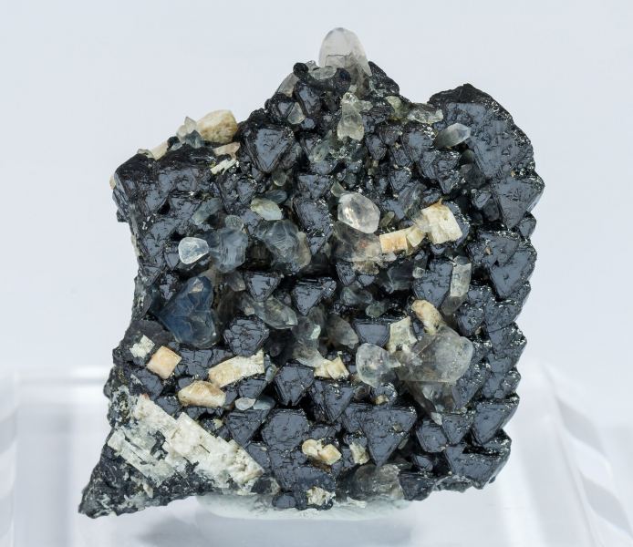 A novelty at Sainte Marie Virtual 2021. Octahedral crystals of Magnetite (titanium-rich variety) in parallel growths and with an aggregate habit that suggests they represent a pseudomorph after an Ilmenite crystal. The lustrous Magnetite crystals show fine growth lines and are partially covered by Microcline and Quartz crystals. Both the Magnetite and the Microcline have been analyzed and we will send a copy of the analysis to the buyer.Imilchil area, Anti-Atlas, Er Rachidia Province, Drâa-Tafilalet Region Morocco (12/2020)