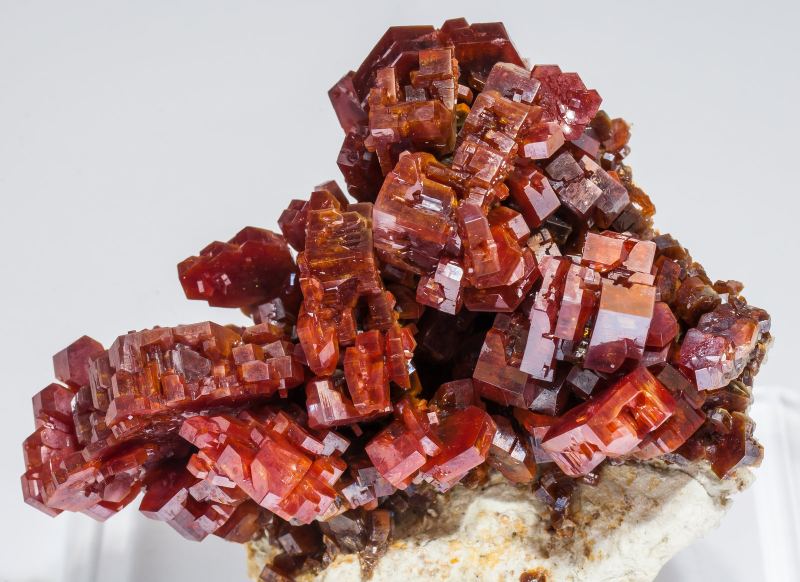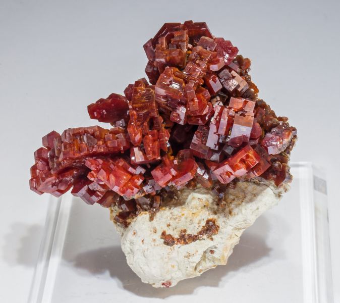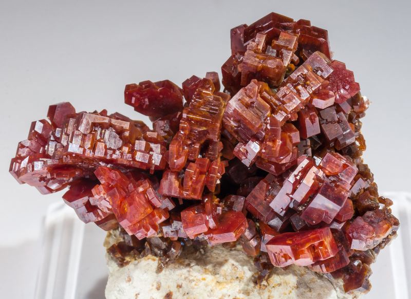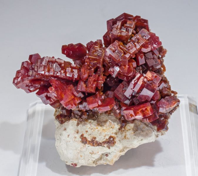 From a 2019 discovery at a greater depth than usual in the Coud'a area. With polycrystalline groups and parallel growths of Vanadinite crystals with a thick tabular habit, on matrix, many of them doubly terminated and with hopper growths. Very lustrous and with a very vivid and uniform magenta-red color, less intense on the back. High quality.Coud'a, Mibladen mining district, Mibladen, Midelt, Midelt Province, Drâa-Tafilalet Region Morocco (04-05/2019)