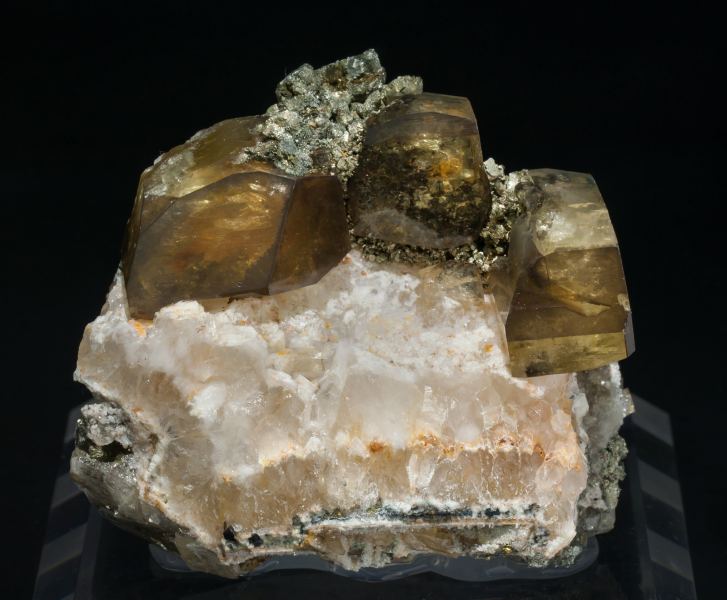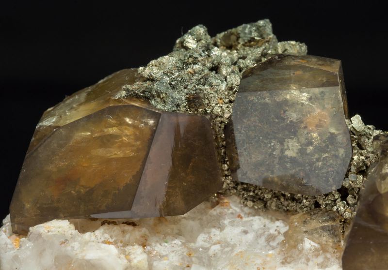 A novelty from the 2014 Ste. Marie Show. Single crystals with very well defined faces and edges, transparent, very bright, with a brownish-yellow color and with darker selective micro-inclusions on some of the faces. On matrix, with Quartz and Pyrite.Bou Nahas Mine, Oumjrane mining area, Alnif Commune, Tinghir Province, Drâa-Tafilalet Region Morocco (04/2014)