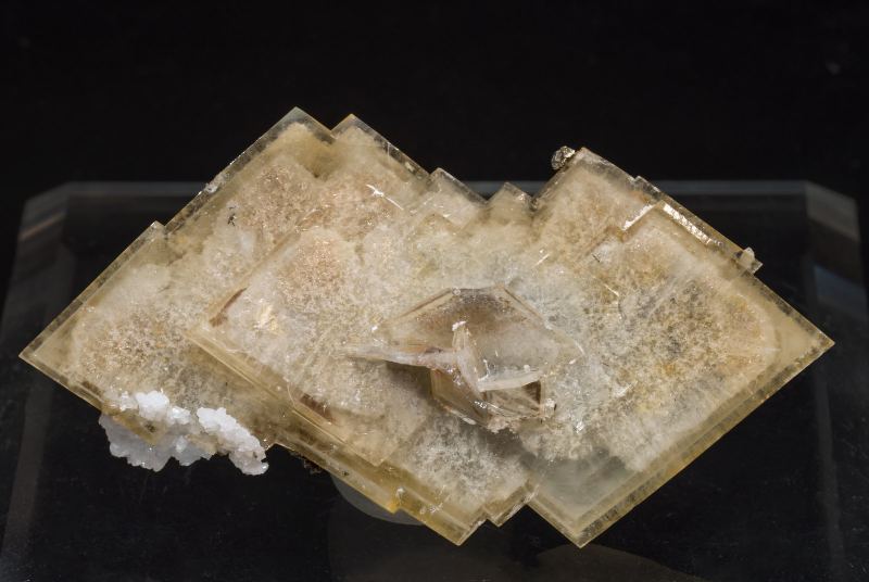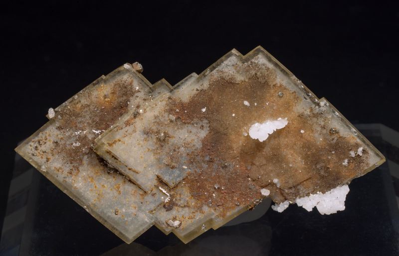 A novelty at Sainte Marie-aux-Mines 2018. Floater aggregate of parallel growths of very sharp thin tabular Baryte crystals, transparent, bright and partially coated by white aggregates of Quartz microcrystals and small Pyrite crystals. The color deserves a separate comment because there is a mixture of reddish yellow, with orange in some areas but mainly concentrated on the edges, and blue locally with greenish hues on the wide main pinacoid faces.Bou Nahas Mine, Oumjrane mining area, Alnif Commune, Tinghir Province, Drâa-Tafilalet Region Morocco (12/2017)