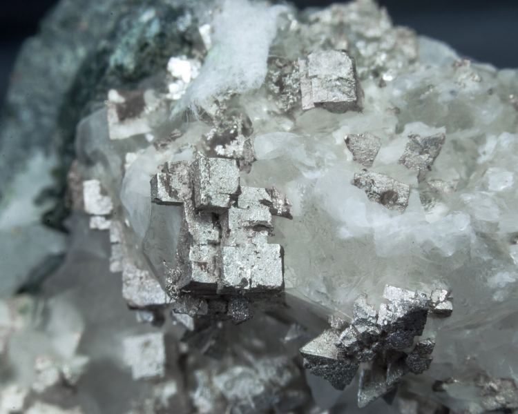 Isolated cubic Silver crystals with extraordinarily well defined and very lustrous faces and edges. On matrix, with Gypsum and Calcite that has been acid-etched.Aït Ahmane, Agdz, Bou Azzer mining district, Zagora Province, Drâa-Tafilalet Region Morocco