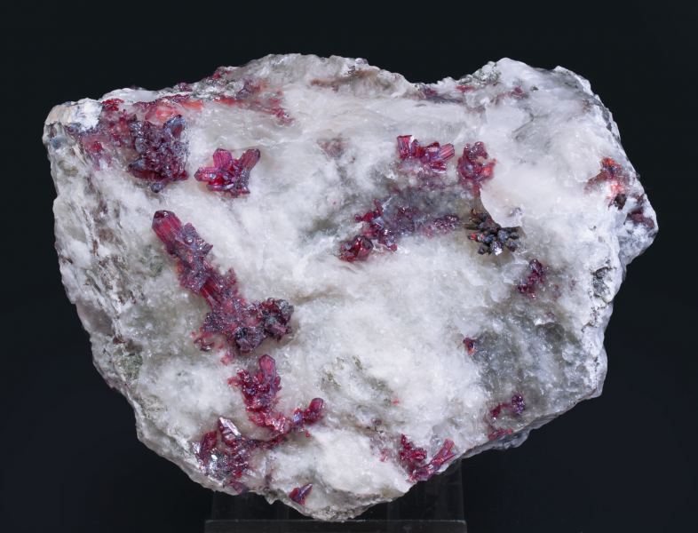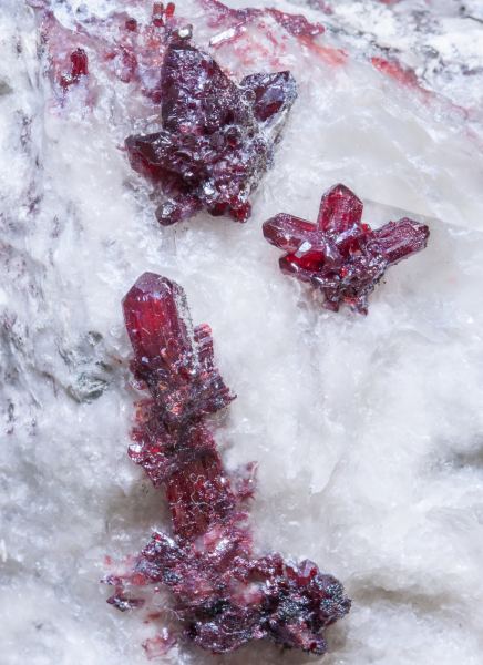 A novelty at Tucson 2019. Groups of Proustite crystals with an elongated prismatic shape, with parallel growths and excellent pyramidal terminations. The crystals, transparent and very bright, have an extraordinary ruby-red color. On a matrix with lenticular Calcite crystals.Aït Ahmane, Agdz, Bou Azzer mining district, Zagora Province, Drâa-Tafilalet Region Morocco (12/2018)