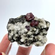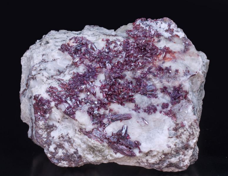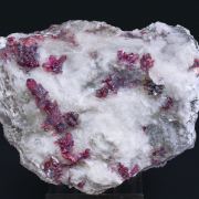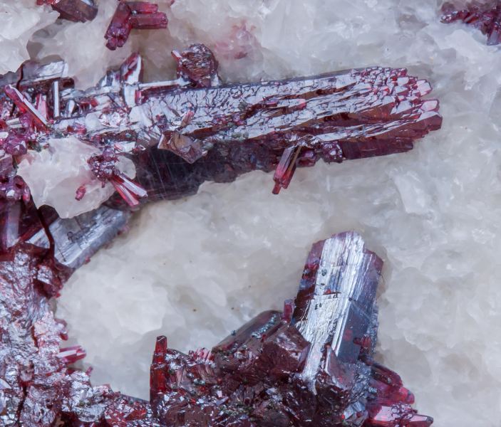 Groups of Proustite crystals of elongated prismatic habit, with excellent terminations, some of them polycrystalline, in Calcite matrix. These high quality crystals are transparent, brilliant, and with an extraordinary ruby red color with mauve tones, very characteristic of this find.Aït Ahmane, Agdz, Bou Azzer mining district, Zagora Province, Drâa-Tafilalet Region Morocco (12/2018)