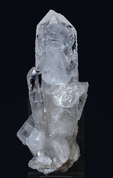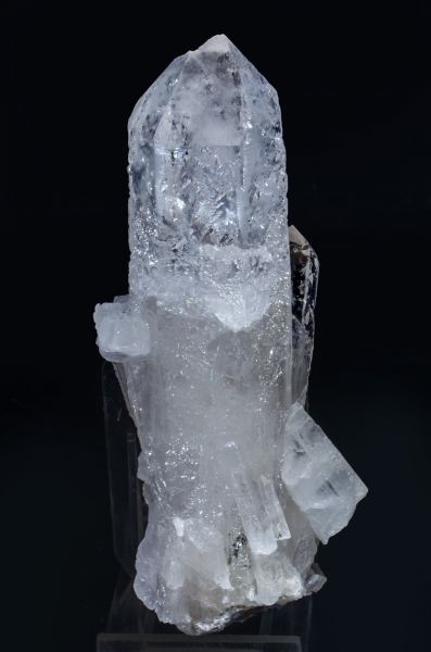 A novelty at Munich 2018. Group of colorless Quartz crystals, one of them clearly dominant, with diffuse phantom growths, abundant geometric growth figures and extraordinarily bright. A beautiful surprise from a very recent find in the Aït Ahmane area of Morocco.Aït Ahmane, Agdz, Bou Azzer mining district, Zagora Province, Drâa-Tafilalet Region Morocco (2018)