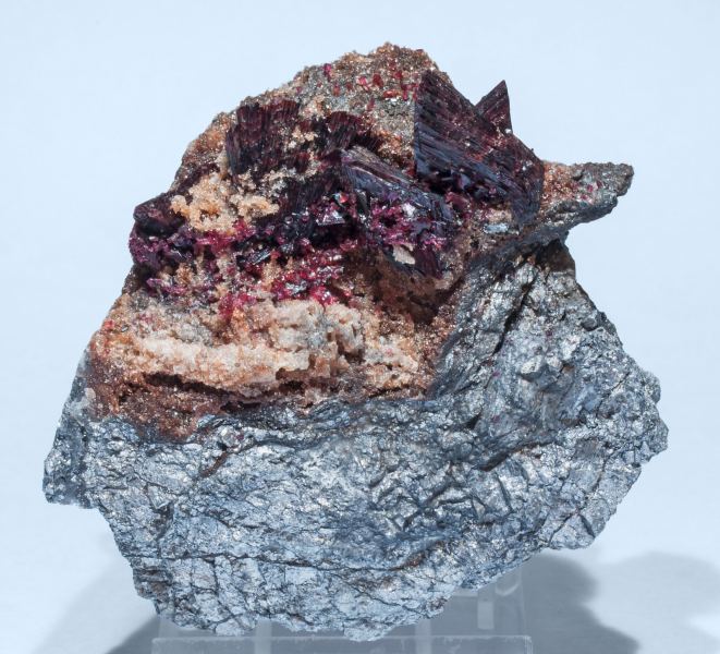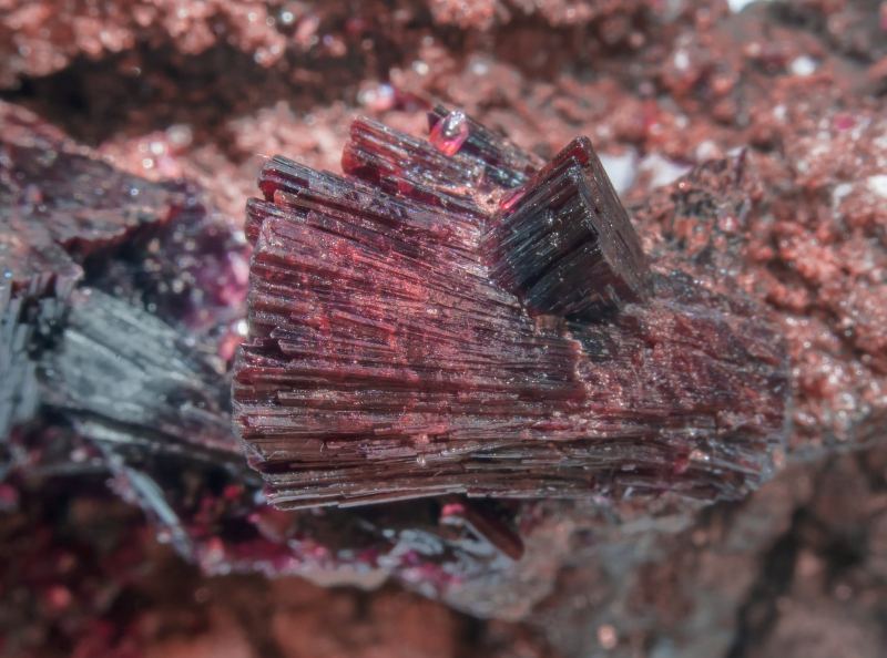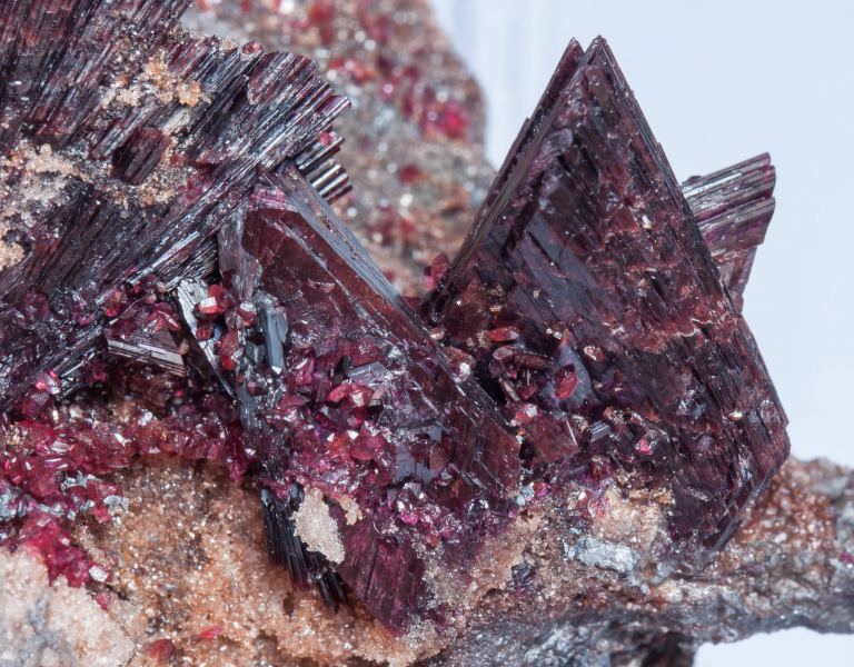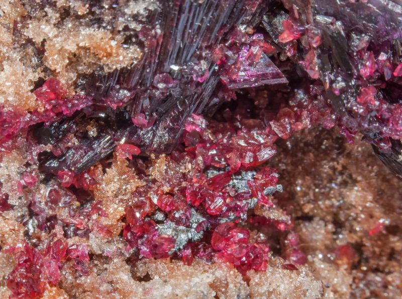 Very sharp and large crystals of Erythrite with fine parallel growths, bright and with a very dense and deep color. On a matrix of massive Skutterudite in which another species with salmon-pink crystals also appears and which we believe may be Talmessite. This specimen is a Moroccan classic with great quality and a very peculiar appearance.Bou Azzer Mines, Bou Azzer mining district, Ouarzazate Province, Drâa-Tafilalet Region Morocco (05/2019)