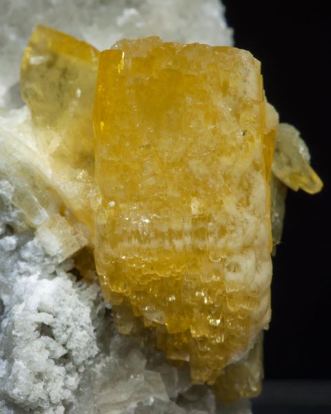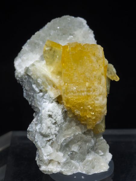A novelty at Munich 2015. Aggregate of Baryte crystals, one of them clearly dominant, with a very intense yellow color, very bright and with very well defined faces and edges. On a matrix with Calcite crystals.Bouismas Mine, Agdz, Bou Azzer mining district, Zagora Province, Drâa-Tafilalet Region Morocco (2015)
