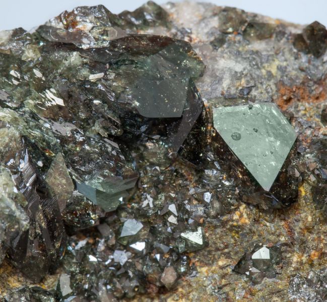 Very sharp Scorodite crystals, transparent, with a very intense vitreous luster, a very uniform olive green color and on matrix. The sample is from a very recent find at the Oumlil mine.Oumlil Mine, Oumlil, Bou Azzer mining district, Zagora Province, Drâa-Tafilalet Region Morocco (09/2017)