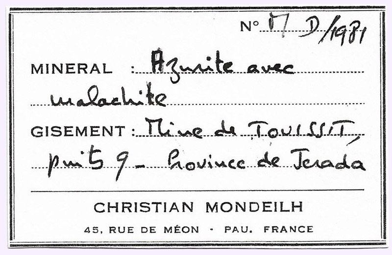 Doubly terminated Azurite crystal, very sharp, with parallel growths, bright color, and crystals of primary Malachite.The specimen comes from the Christian Mondeilh collection, whose label we will send to the buyer.