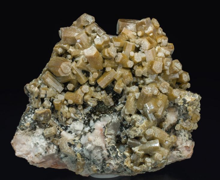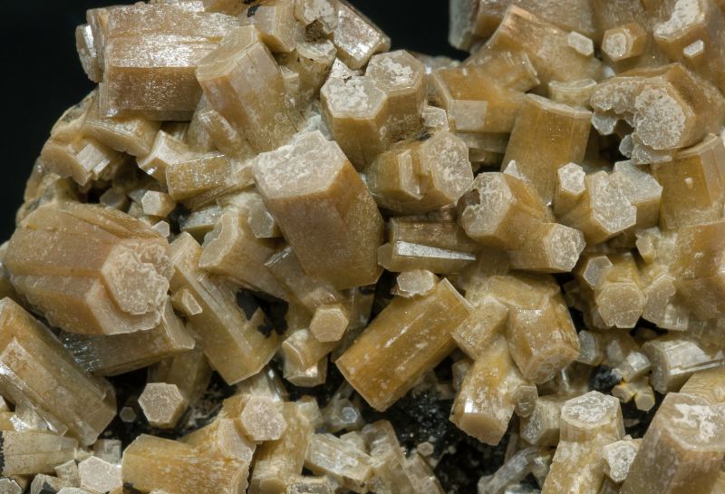 Vanadinite (variety arsenic-bearing vanadinite) crystals, many of them doubly terminated, with very well defined faces and edges, a creamy color, clearer and brighter than usual with this kind of Vanadinite, and on a Dolomite matrix. Associated on the matrix are small black Mottramite crystals. These arsenian Vanadinite are currently accepted as a Moroccan classic.Touissit, Touissit District, Jerada Province, Oriental Region Morocco