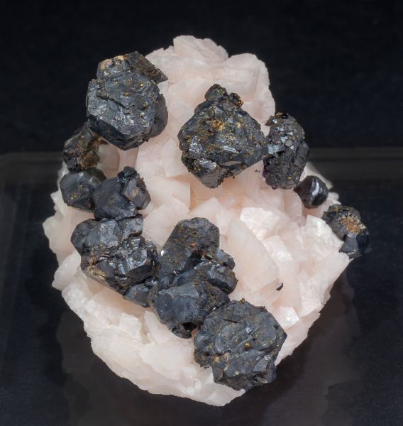 A novelty at the 2020 Munich Virtual show. Complex crystals of Sphalerite with equidimensional habit and very well defined faces and edges, translucent, lustrous, on matrix, covered by pale pink, rhombohedral Dolomite crystals. This material was practically unknown until now.Zelidja Mine, Touissit-Bou Bekker mining district, Jerada Province, Oriental Region Morocco