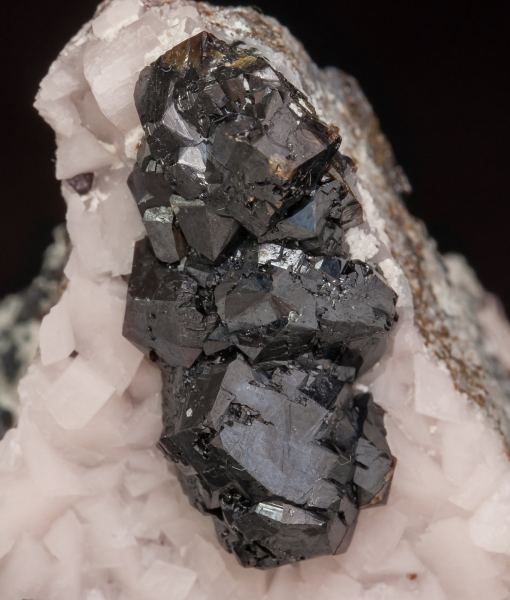 A novelty at the 2020 Munich Virtual show. Complex crystals of Sphalerite with equidimensional habit and very well defined faces and edges, translucent, lustrous, on matrix, covered by pale pink, rhombohedral Dolomite crystals. This material was practically unknown until now.Zelidja Mine, Touissit-Bou Bekker mining district, Jerada Province, Oriental Region Morocco