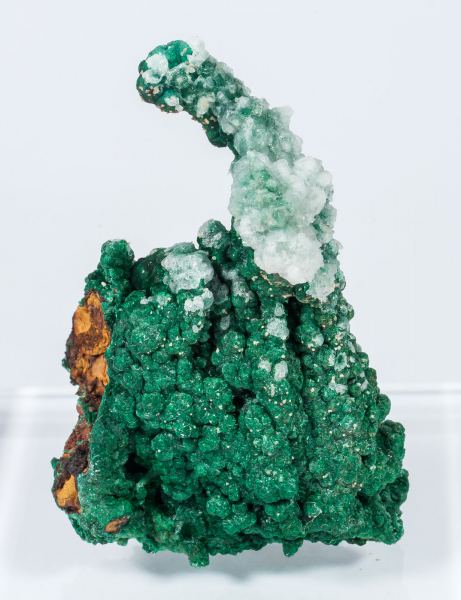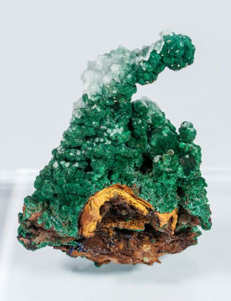 A novelty at Sainte Marie Virtual 2021. Stalactitic growths, on a limonite matrix, of spheroidal Malachite aggregates with a silky luster and deep color, and with white Calcite coatings, and small acicular crystals of Cerussite. The specimen comes from a discovery in 2021 in the Sidi Ayad area (but not in the Sidi Ayad mine).Georges vein, Sidi Ayad (Sidi Ayed), Boulemane Province, Fès-Meknès Region Morocco (02/2021)