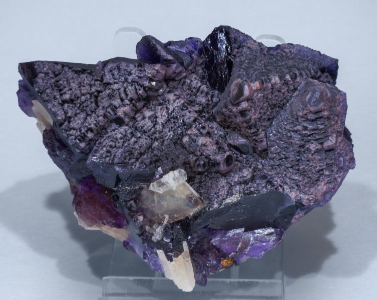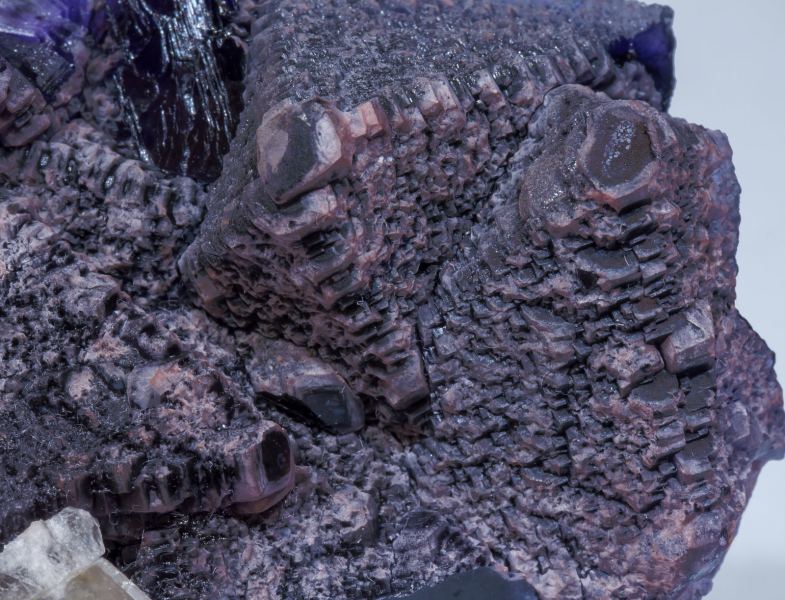 A novelty at Sainte-Marie-aux-Mines 2018. Group of octahedral Fluorite crystals with polycrystalline surfaces that have cubic morphology. They are translucent, with a deep violet color and partially coated by groups of white, deformed and very acute Baryte crystals. It is from a new locality, found thanks to intensive prospective works looking for Baryte in Morocco, in which accidentally appeared also this Fluorite.Debdou (Dabdou), Taourirt Province, Oriental Region Morocco (03-06/2018)