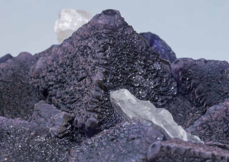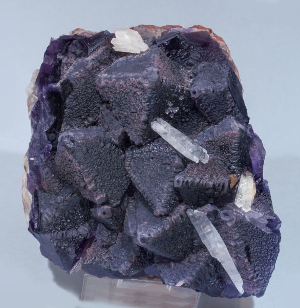 A novelty at Sainte-Marie-aux-Mines 2018. Group of octahedral Fluorite crystals with polycrystalline surfaces that have cubic morphology. They are translucent, with a deep violet color and partially coated by groups of white, deformed and very acute Baryte crystals. It is from a new locality, found thanks to intensive prospective works looking for Baryte in Morocco, in which accidentally appeared also this Fluorite.Debdou (Dabdou), Taourirt Province, Oriental Region Morocco (03-06/2018)