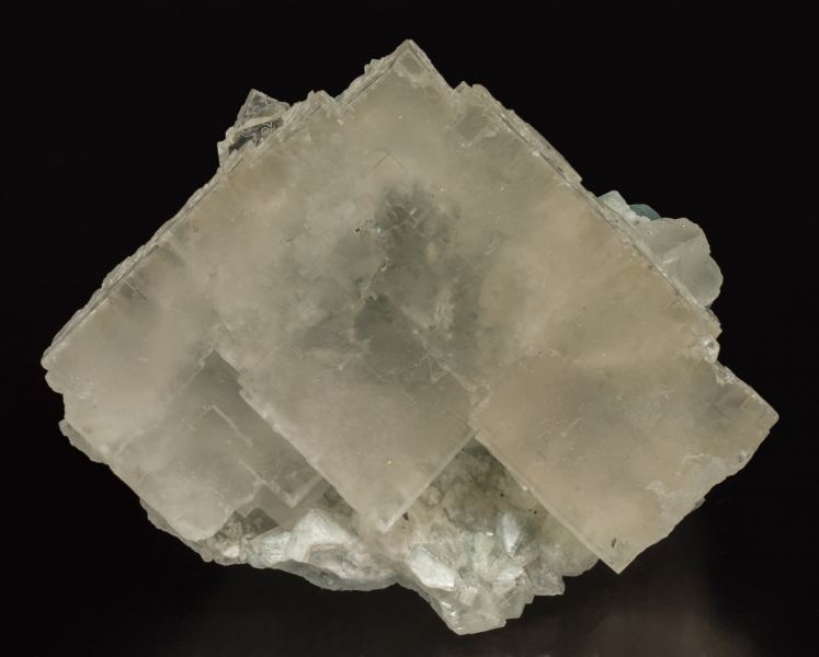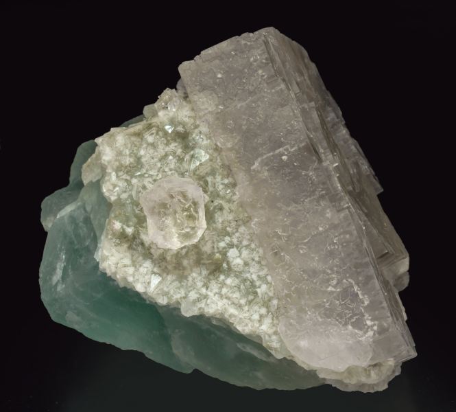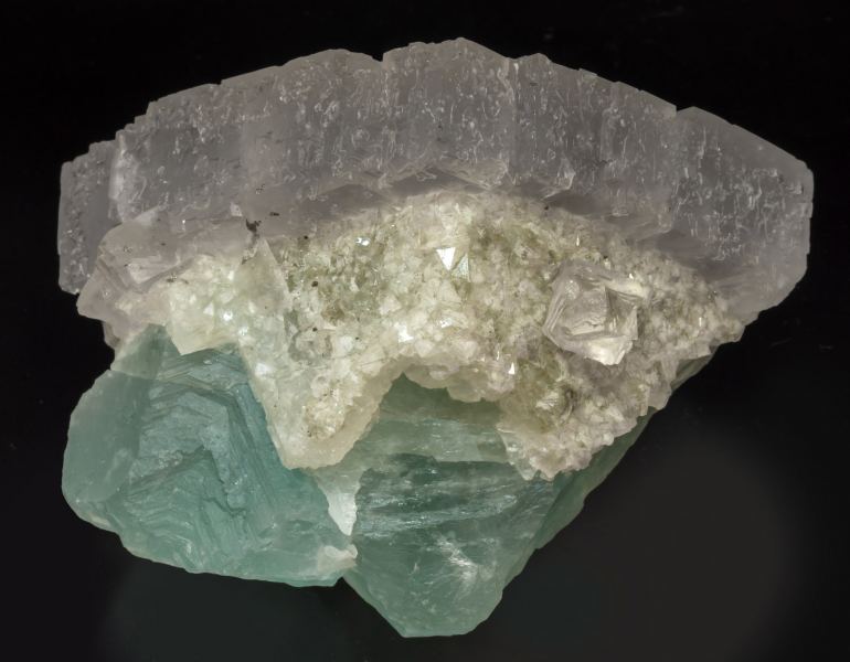 A curiosity. Two generations of Fluorite crystals interrupted by a growth of Quartz crystals. The first, crystalline with bluish green color, supports a group of very sharp cubic crystals with an unusual slightly pinkish color.El Hammam, Ait Mimoune, Khémisset Province, Rabat-Salé-Kénitra Region Morocco