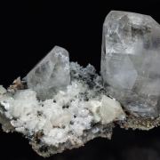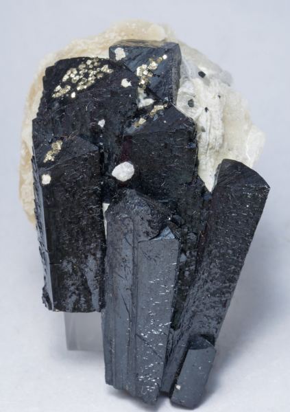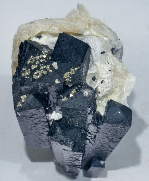 Aggregate of Ilvaite crystals with bright and very well defined faces and edges, on a matrix of very platy Calcite crystals partially coated by small cubic Pyrite crystals. The Ilvaites from Dalnegorsk, relatively abundant some years ago, are now scarce, even moreso in this quality.Dalnegorsk, Dalnegorsk Urban District, Primorsky Krai Russia