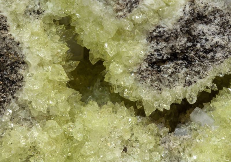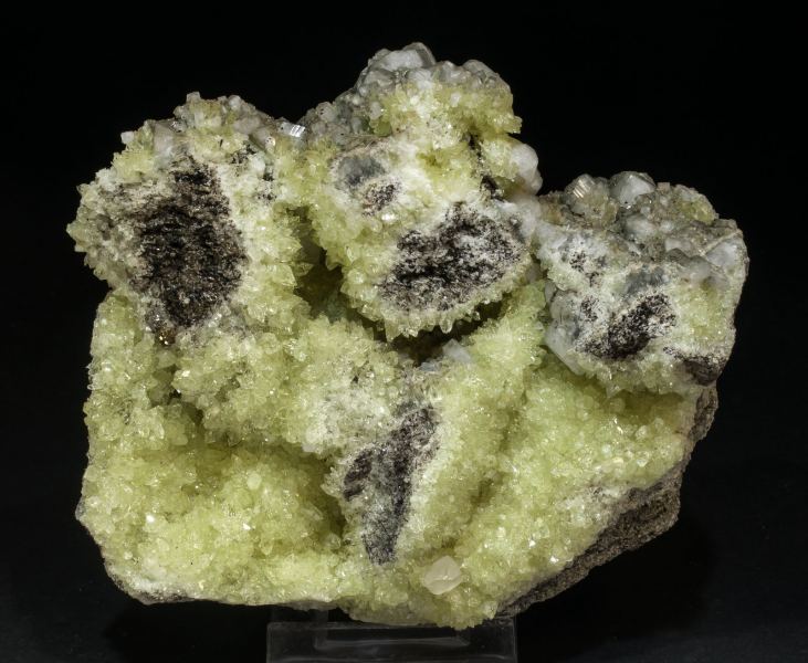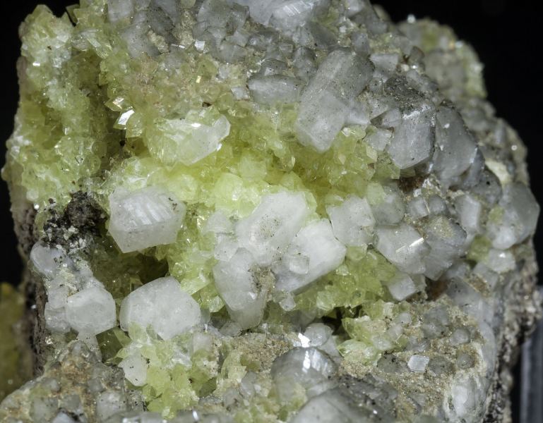 Crusts on matrix of small elongated crystals of Fluorapophyllite-(K), transparent, extraordinarily bright and with an intense and uniform yellow color. With white crystals of Calcite and crystals of greyish white Harmotome. The specimen comes from an extraordinary find in 1965 from which only a limited number of pieces were obtained.Korsnäs Lead Mine, Korsnäs, Vaasa municipality, Ostrobothnia Finland (1965)